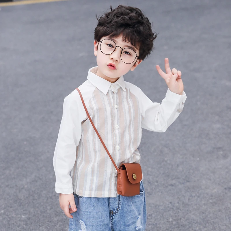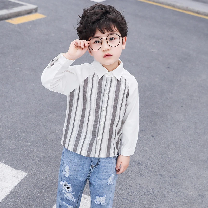 الأولاد في الخريف القطن وقميص الكتان 2021 النسخة الكورية من الشريط الرأسي الصغير والصغيرة الطويلة -قميص قميص غير رسمي ملابس الأطفال ملابس الأطفال